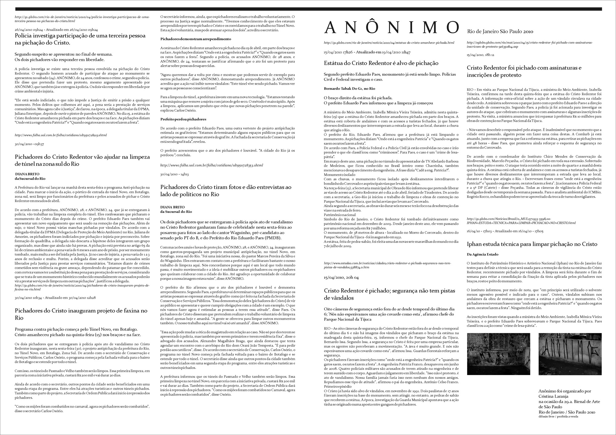 Preparação: ler os artigos de jornal da Folha de São Paulo e do Jornal O Globo que narram a pixação do Cristo Redentor, em abril de 2010. Reproduzir e sistematizar os artigos de jornal, organizados por data. Alterar os nomes próprios dos pixadores por ANÔNIMO. Editorar e imprimir o Anônimo.