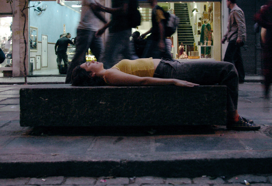Realização: deitei-me na Rua Uruguaiana por cerca de 15 minutos permanecendo em silêncio e imóvel. A ação faz parte do projeto “Anecóicas”, montado em uma instalação na Galeria Anita Schwartz, em Junho de 2008, Rio de Janeiro, RJ.